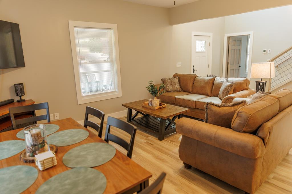 The 3 bedroom, 2 ½ bath Minnie’s Place, sleeps 6 and has 1 king primary bedroom with primary full bath ensuite on the main floor while on the upper floor are two queen bedrooms and full guest bath. A guest half bath is located on the main living space floor. The large open living area with its overstuffed couch and loveseat features a large screen Fire TV perfect for streaming and logging into your own favorite apps. A formal dining table and full kitchen with brand new appliances, plus laundry closet with washer/dryer rounds out the main floor living space. For those of you wishing to dine alfresco and enjoy the sights and sounds of Waynesville, there is an outdoor dining area on the front porch as well as rockers to take in the cool mountain air at night, plus to the rear of this property is a large brick patio with picnic tables and charcoal park grill for the bbq chefs in your group. High speed internet and Wi-Fi complete the package.